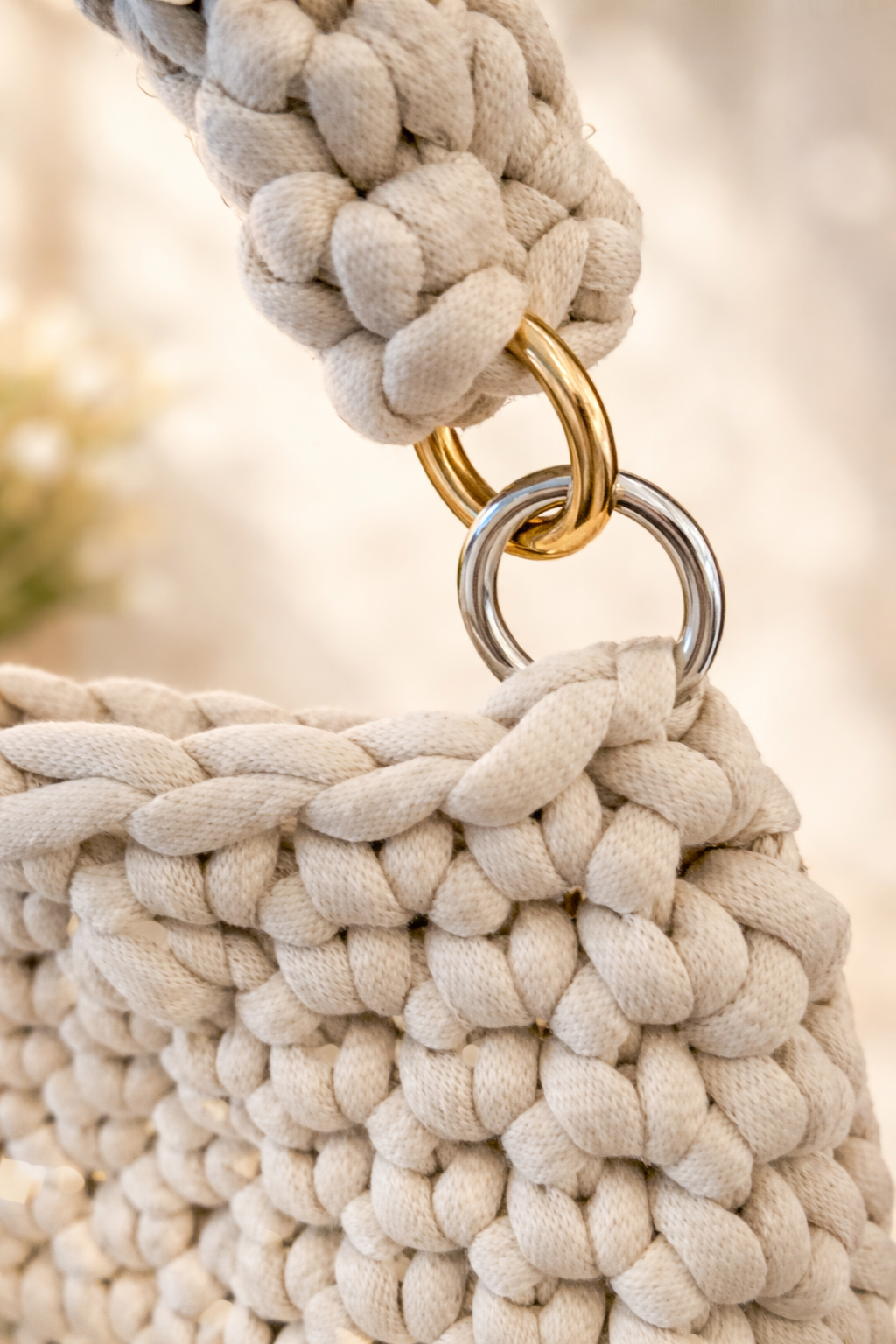 Egg bag beige fait en tube de mousse 60% coton 40% Polyester anneaux argent et doré