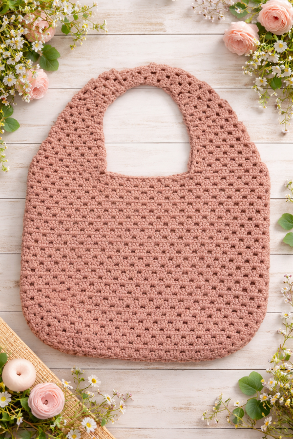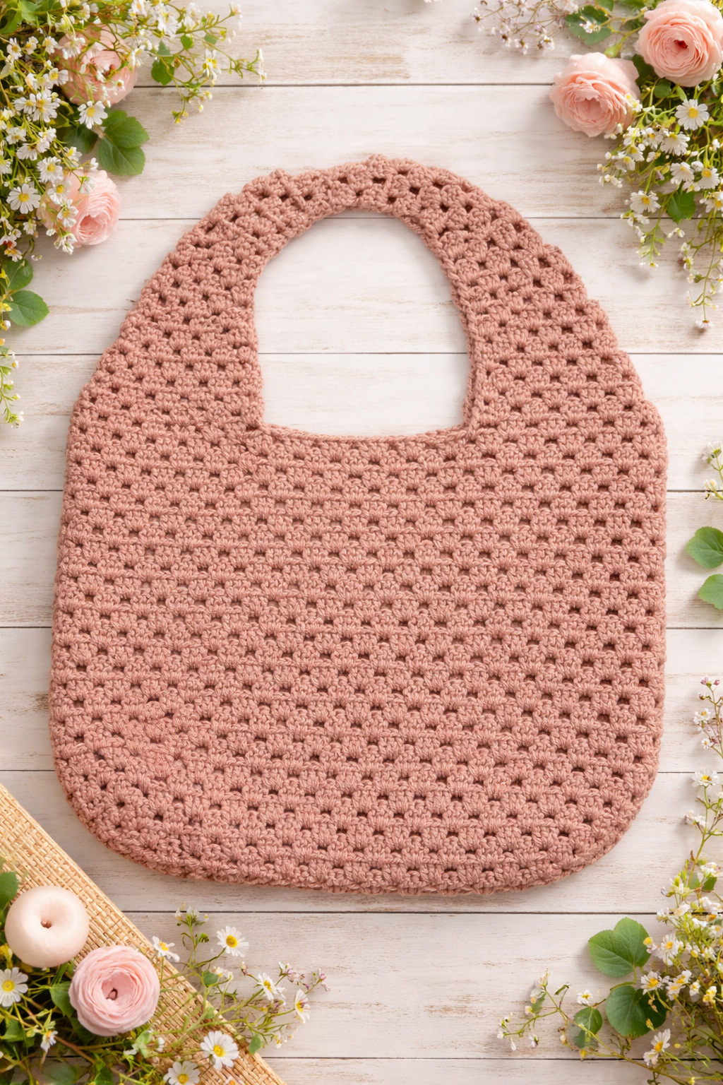 Très joli tote bag rose saumon 100% acrylique de haute qualité. Il mesure 45 cm de large et 32 de hauteur. Totalement réalisé au point granny.